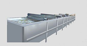 化冰機(jī)采用氣泡與熱水協(xié)作,有效地使物料充分解凍,物料落入水中,利用槽體中翻騰的水將物料攪動(dòng),把冷氣帶出擴(kuò)散到空氣當(dāng)中。
